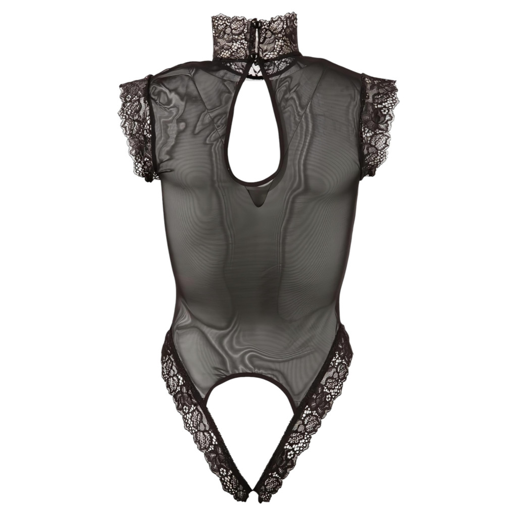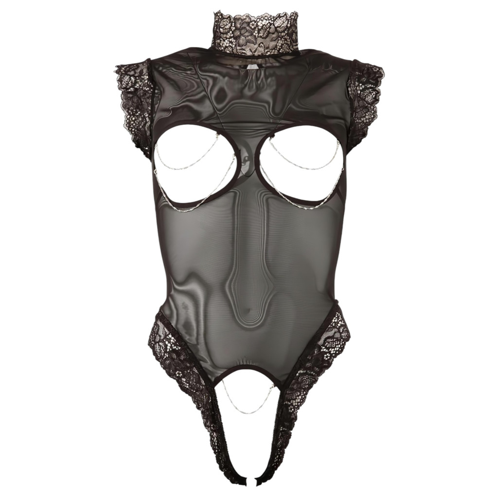 Áttetsző fekete, rugalmas anyagból készült body, fodros csipkeberakásokkal és különleges láncos díszítésekkel, melyek levehetőek.