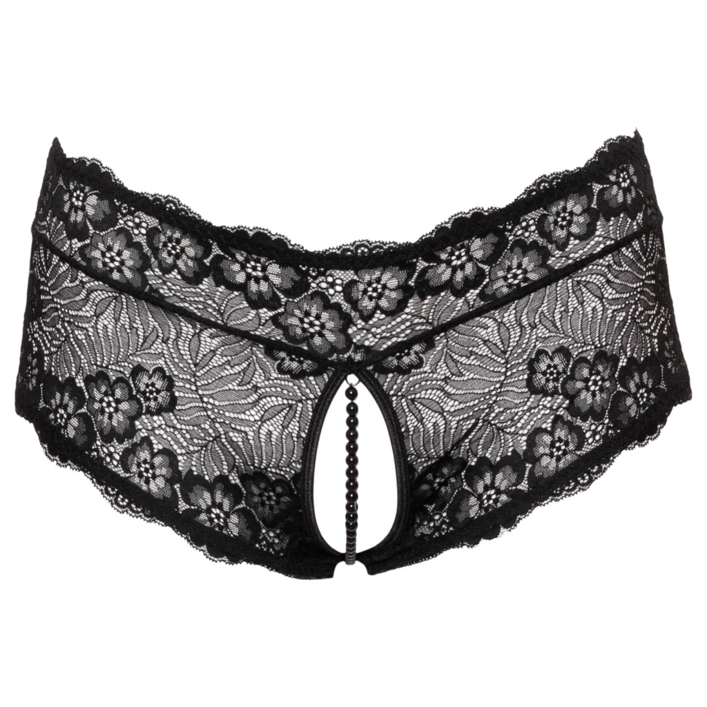 1 db nyitott csipke bugyi (fekete), stimuláló gyöngylánccal és szatén fűzéssel
