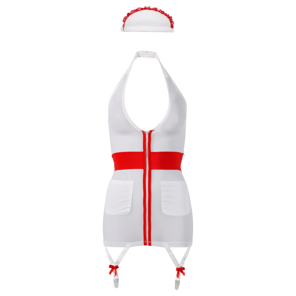 Rugalmas, áttetsző anyagból készült, nyakpántos miniruha, elöl végig cipzárral, két zsebbel és lent két harisnyatartó pánttal. Extra mély dekoltázzsal, a derékrészen piros csíkkal.Anyaga: 90% Polyamid, 10% Elasthan.A csomag tartalmazza a fehér színű, piros fodros főkötőt is.A főkötő anyaga: 95% Polyester, 5% Elasthan.A harisnyát és egyéb kiegészítőket a csomag nem tartalmazza.