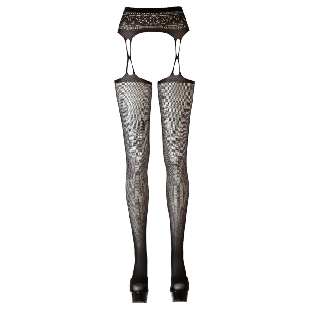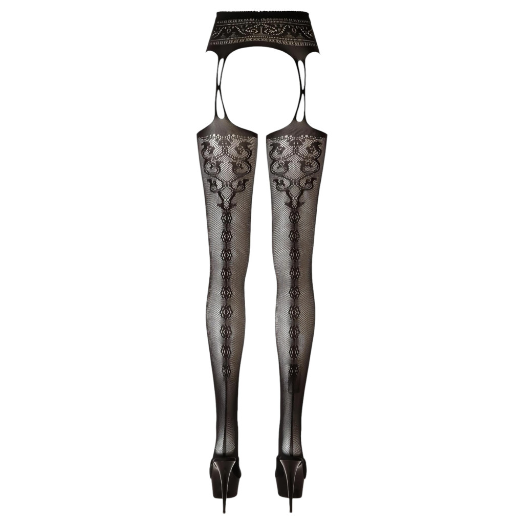 Harisnya és harisnyatartó egybevarrva vékony pántokkal, csipke hatású díszítésekkel és merész motívumokkal.