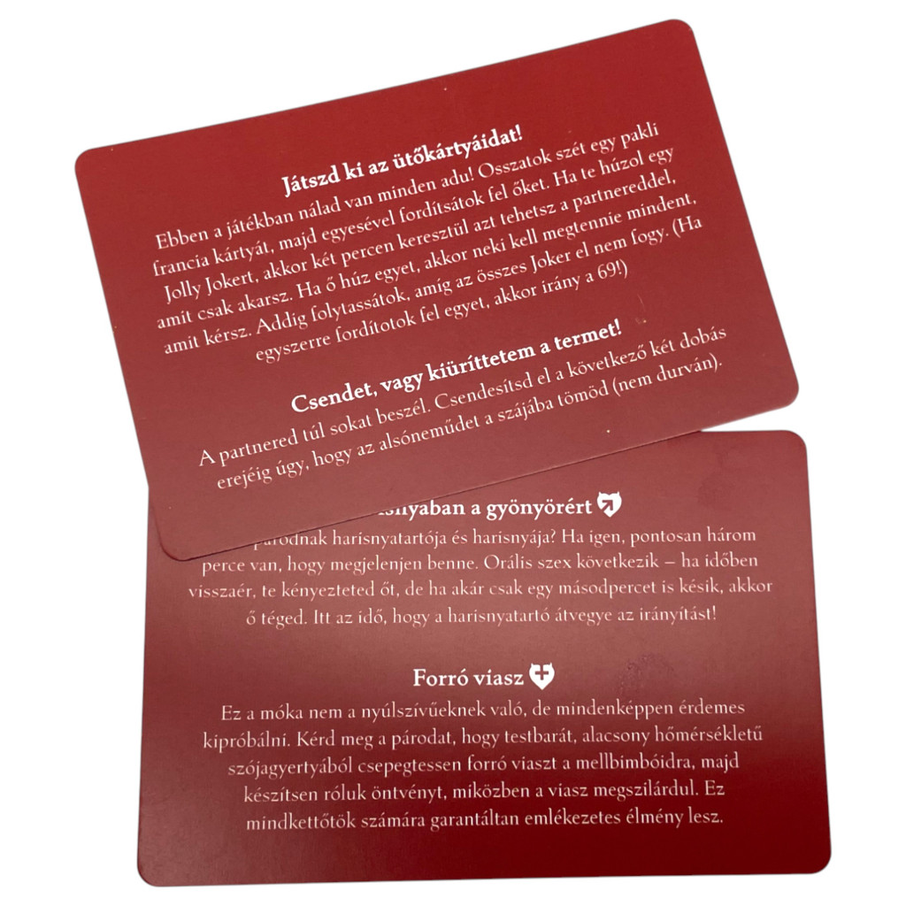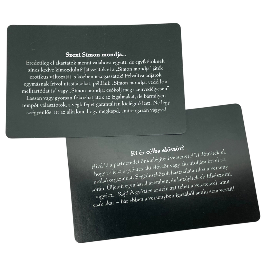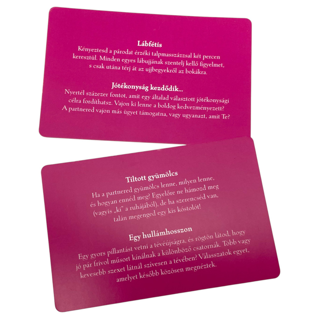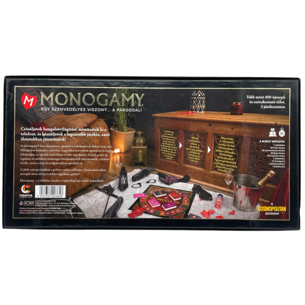 A Monogamy társasjátékból már több, mint 1 millió példány kelt el Világszerte!Egy kétszemélyes, felnőtteknek szóló, maximálisan szórakoztató, romantikában, izgalmakban, de legfőképpen erotikában gazdag párjáték, mely biztos élvezetet és intim pillanatokat nyújt a játékosoknak, megfűszerezve ezzel a párkapcsolatot, és még közelebb hozva egymáshoz a szerelmeseket!Nincs más feladatotok, mint megteremteni a megfelelő hangulatot a környezetetekben, lágy zenével, gyertyafénnyel, majd mindezek után néhány dobás a dobókockákkal és elmerülhettek a Monogamy-ban, mely a szerelem, a szenvedély és a bujaság társasjátéka.A játék során több, mint 390 szórakoztató feladat vár rátok, három különböző szinten (Intim, Szenvedély, Forró). Ahogy a játék halad előre vidám párbeszédekben és izgalmas feladatokban lesz részetek, mialatt egyre többet tudtok meg egymás testéről, elméjéről, egyre közelebb érve ahhoz a felismeréshez, hogy mi az, ami a párotokat igazán lázba hozza! A szinteken előrehaladva ahogy a hangulatotok egyre fokozódik, úgy válnak a feladatok is egyre intimebbekké, szenvedélyesebbekké, forróbbakká!Mi is rejtőzik a dobozban?:-1db játéktábla-2db bábu-12 színes karika (4db pink, 4db lila, 4db piros)-1db dobókocka-50db Fantázia kártya-65db Intim kártya-65db Szenvedély kártya-65db Forró kártya-1db játékleírás