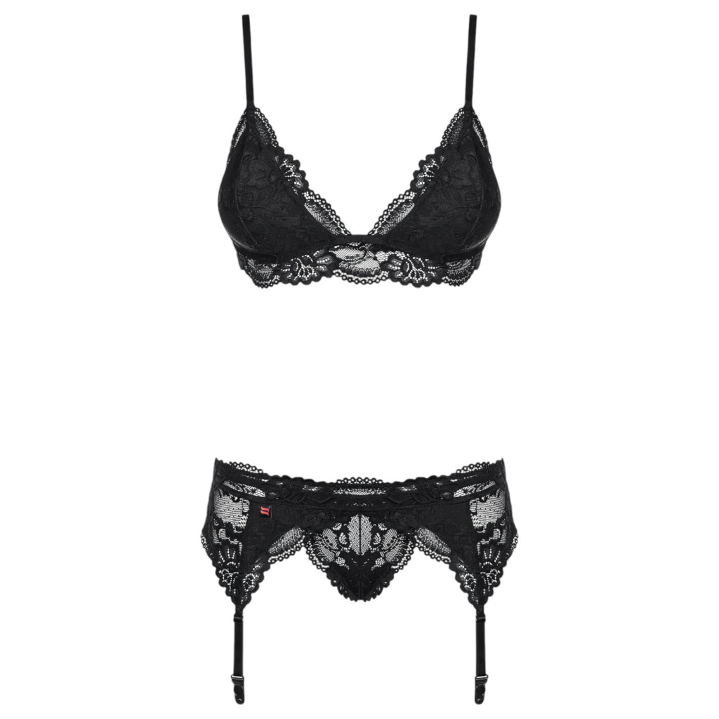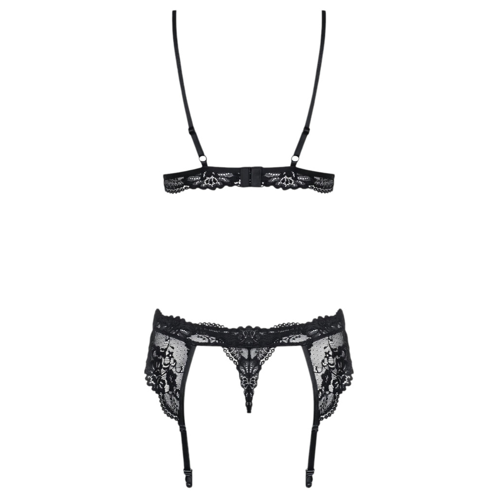 A szett tartalma:Dupla hatású melltartó:-puha, kényelmes, átlátszatlan anyagból-áttetsző, virágmintás csipkével borítva-enyhén bélelt mellrésszel-állítható vállpántokkal-hátul fém kapcsokkalCsipke harisnyatartó:-puha, áttetsző, virágmintás csipkéből-hullámos szegélyekkel és derékpánttal-4db állítható harisnyatartó pánttal-rugalmas derékpánttalVirágos csipke tanga:-puha, rugalmas csipkéből-rugalmas pántokkalA szett anyaga: 90% Polyamid, 10% Elasthan.Fekete színben.A szett a harisnyát nem tartalmazza.