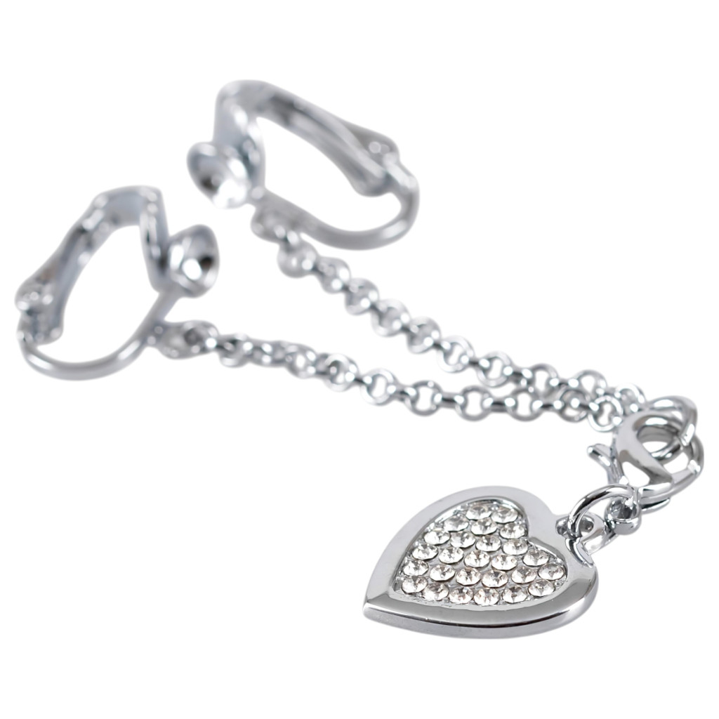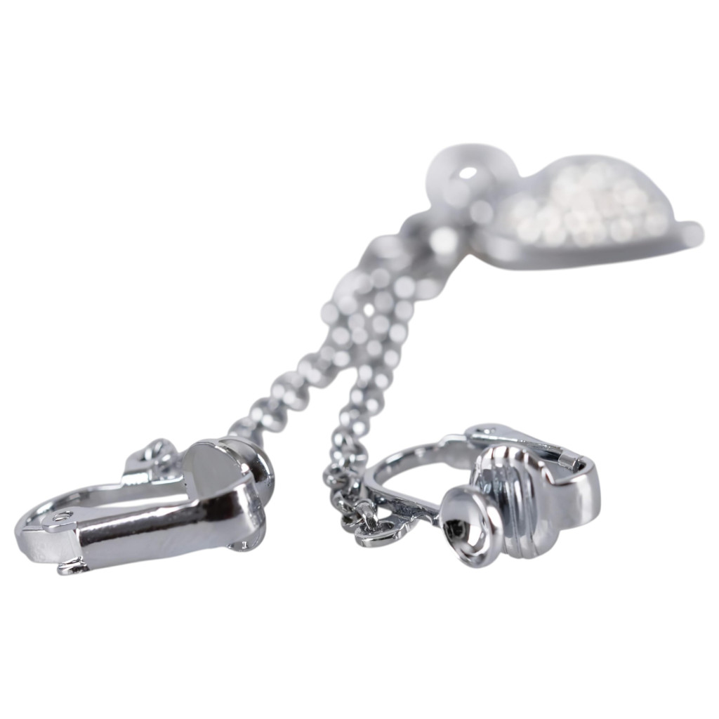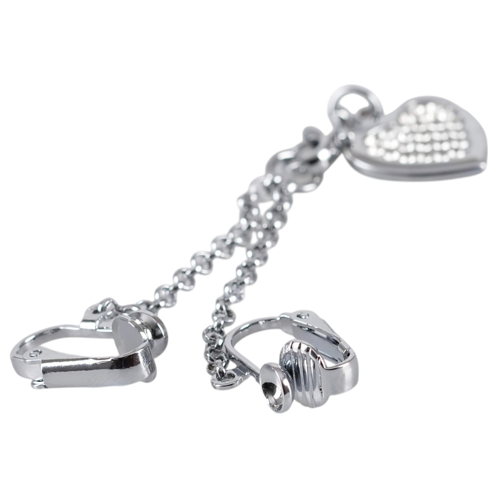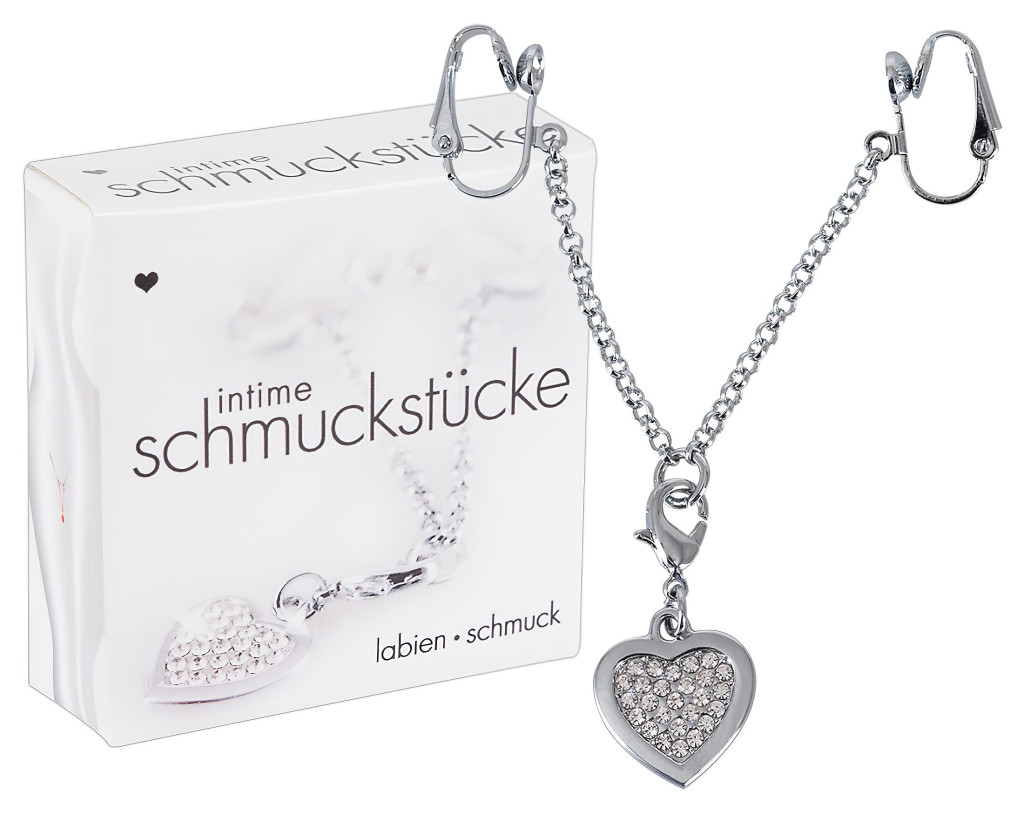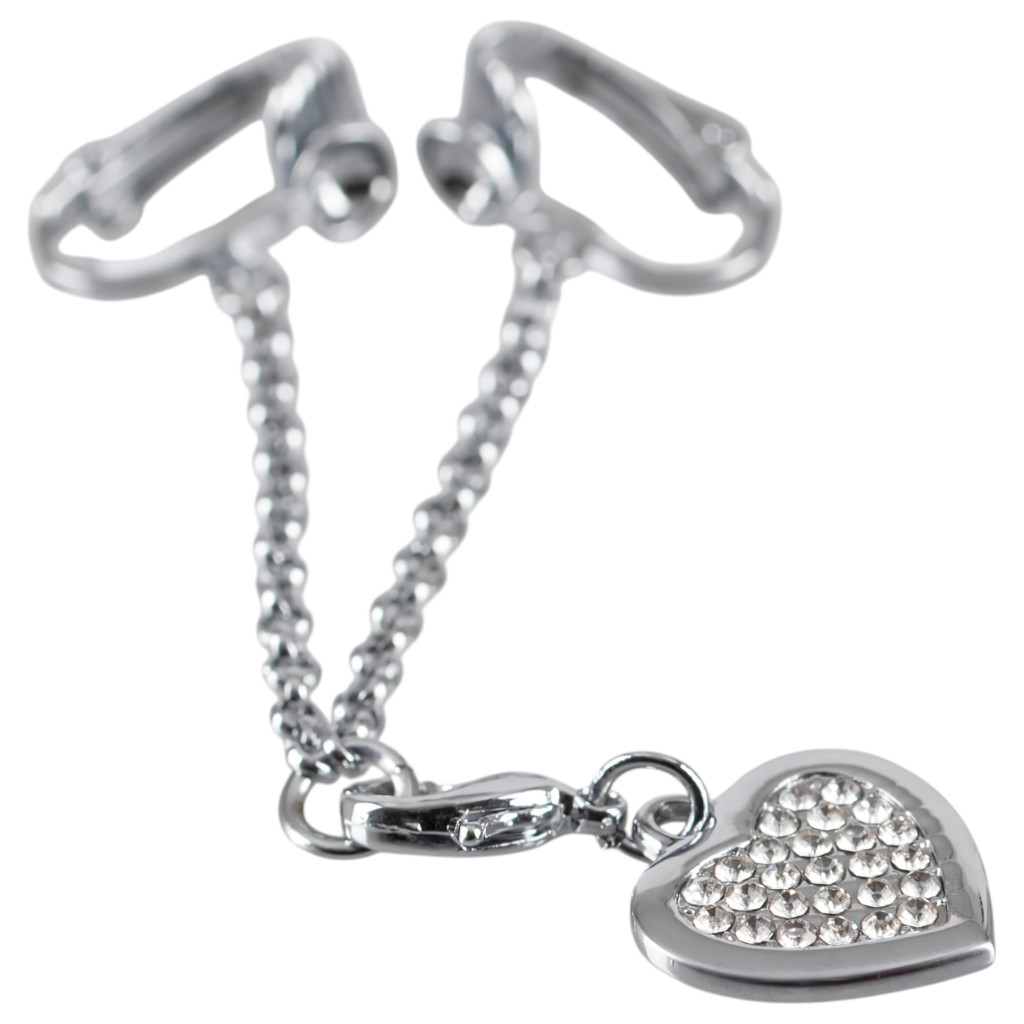 Két klipsz, melyek a szeméremajkakra csíptethetőek, kis rövid lánccal összekötve és ezüst színű szív medállal, melyet apró, csillogó, fehér strasszkövek díszítenek.