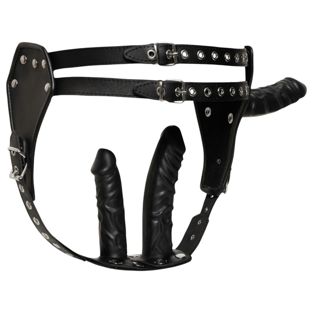 Kiváló minőségű, állatható, dupla pántokkal felszerel, valódi bőr alsó külső és két belső (hüvelyi + anál) dildóval (akár egy felcsatolható hímtag).A külső dildó hossza: 15cm. A külső dildó átmérője: 4cm.A belső hüvelyi dildó hossza: 14cm.A belső dildó átmérője: 3,5cm.A belső anál dildó hossza: 11,5cm.A belső anál dildó átmérője: 3cm.Anyaga: fém, valódi bőr (alsó), 100% latex (dildók).Fekete színben.Mérete: S-L (egyenméret: S, M és L méretekre passzol).FIGYELEM: a Latex, natúr gumi az arra érzékenyeknél allergiát válthat ki.
