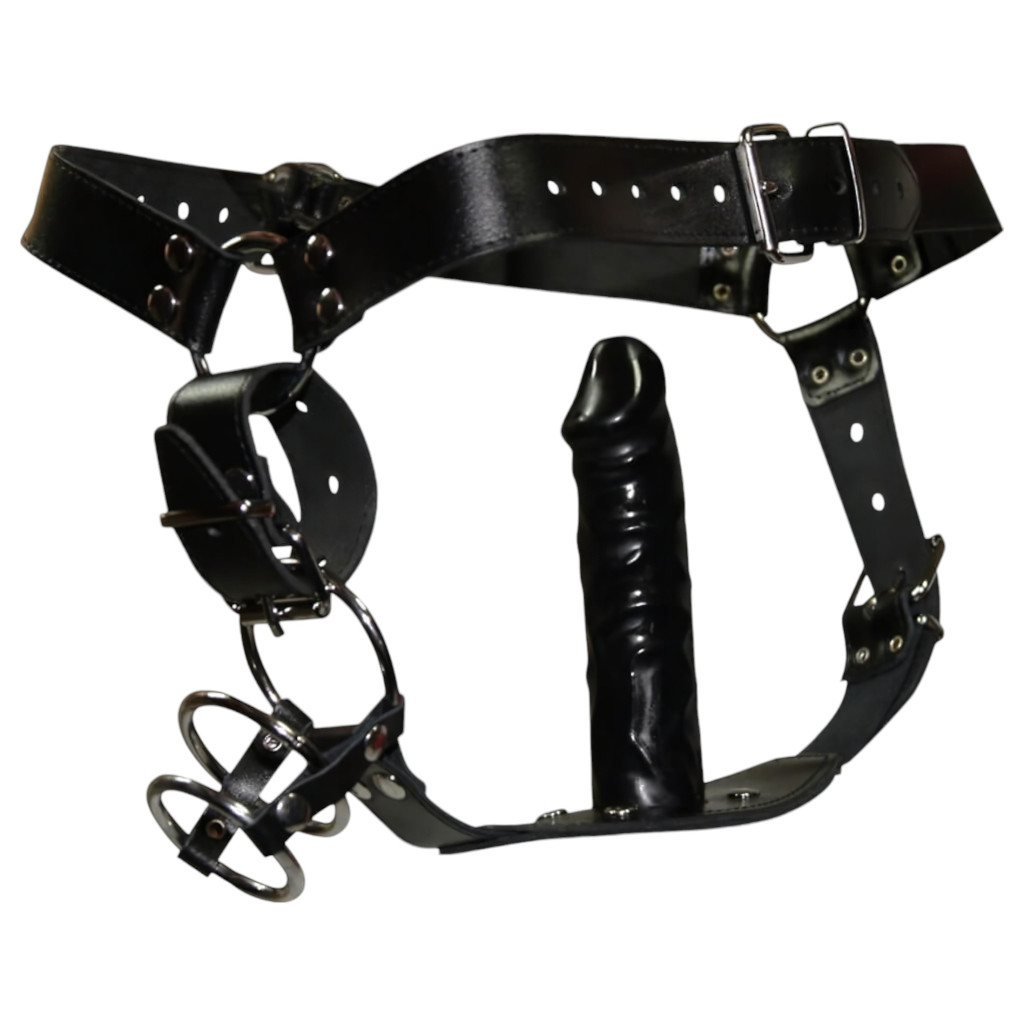 Fekete bőr tanga állítható derékpánttal. Három fém pénisz-/heregyűrűvel (két darab átmérője 4,5cm-es, és egy darab átmérője 4cm-es). Beépített latex análdildóval (14cm hosszú, átmérője 3,5cm). Fekete.