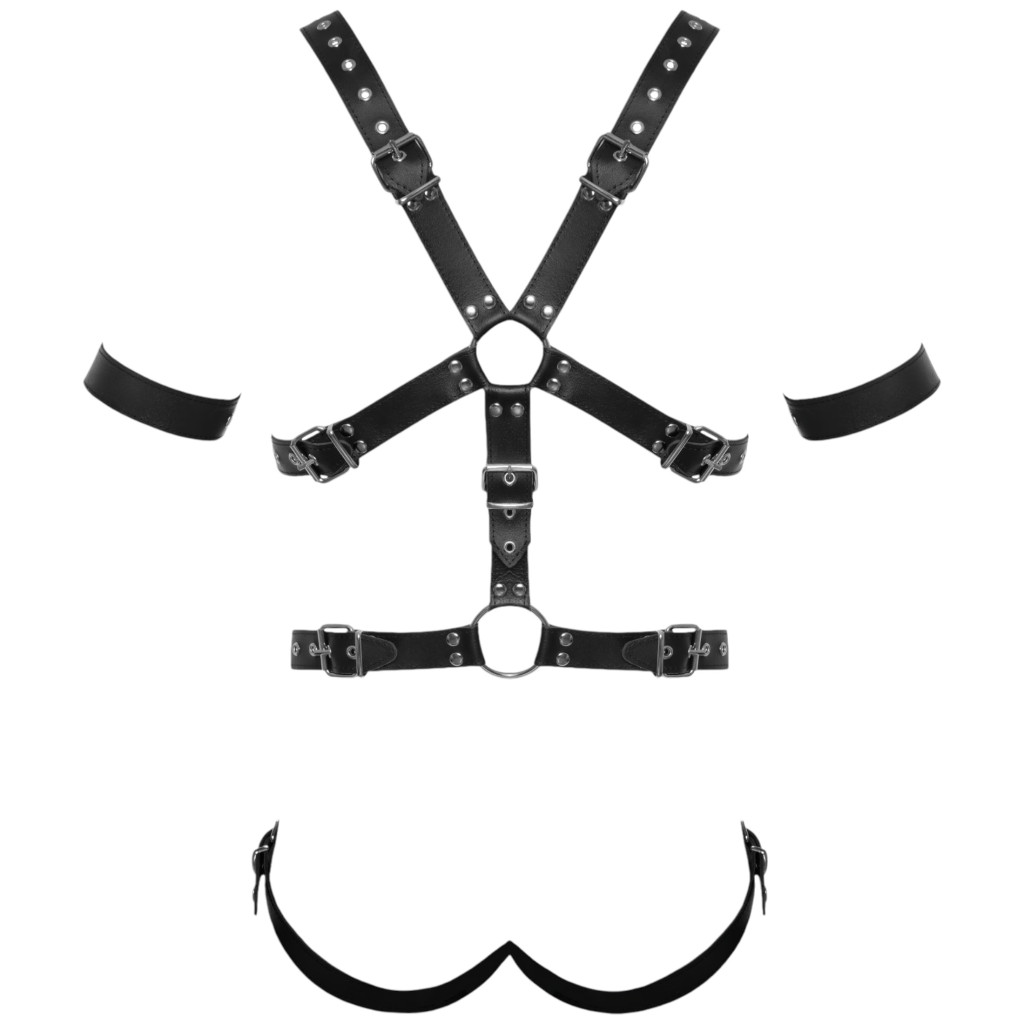 Kiváló minőségű, nagy szakítószilárdságú, valódi bőr pántokból készült body férfiaknak. A hatást még tovább fokozzák a fém gyűrűs és szegecses megoldások, valamint a pénisztartó rész, mely 3 különböző átmérőjű fém karikából tevődik össze. A gyűrűk átmérője: 4cm, 4,5cm és 5cm. A bőr pántok mérete fém csattal állítható a megfelelő méretre.