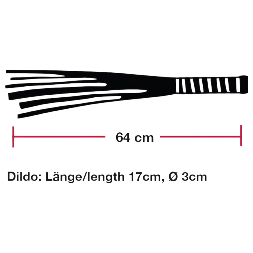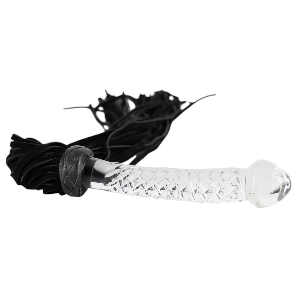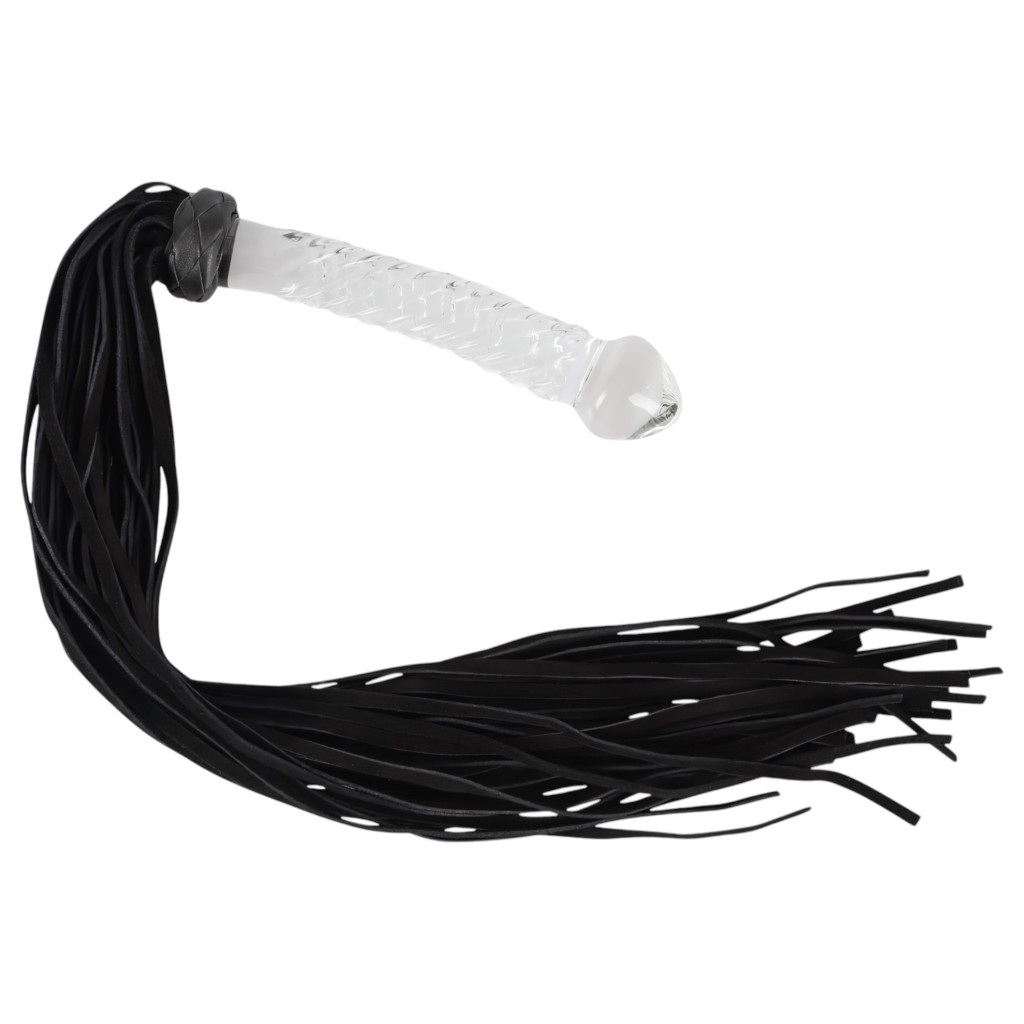Valódi bőr szálakból álló korbács, üveg nyéllel.Teljes hossz: 64cm.A nyél teljes hossza: 16cm.A nyél átmérője: 3cm.Anyaga: üveg (nyél), hasított bőr.Fekete színben, áttetsző nyéllel.