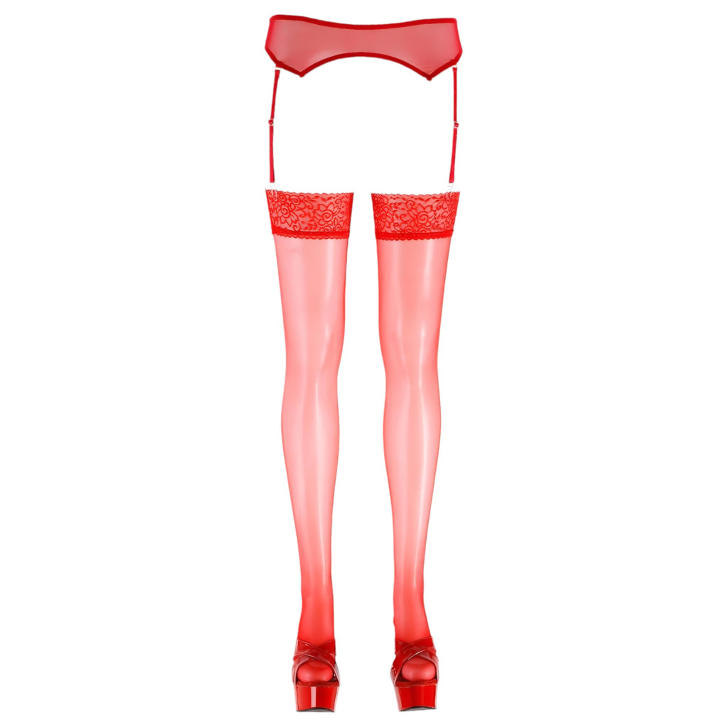 Vadító piros színben készült, szexi harisnya, gyönyörű, széles (8cm), szemet gyönyörködtető csipkeszegéllyel.