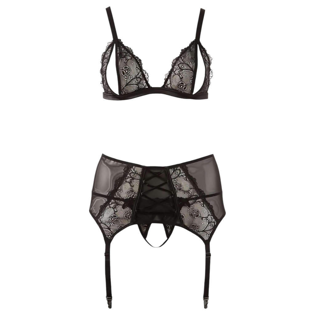 Áttetsző, rugalmas anyag és puha csipke kombinációjából készült szett, melynek tartalma: