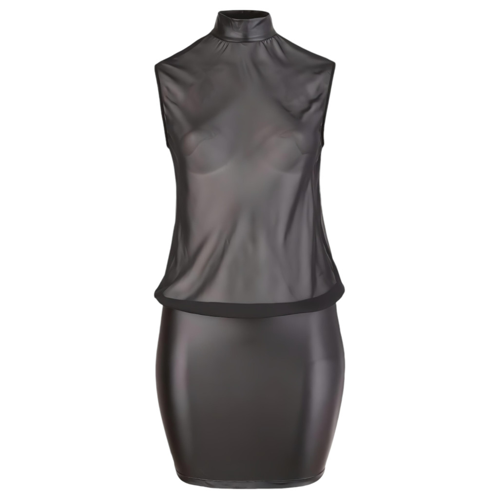A csomag tartalma:1 darab fekete mini ruha álló gallérral és áttetsző felsőrésszel
