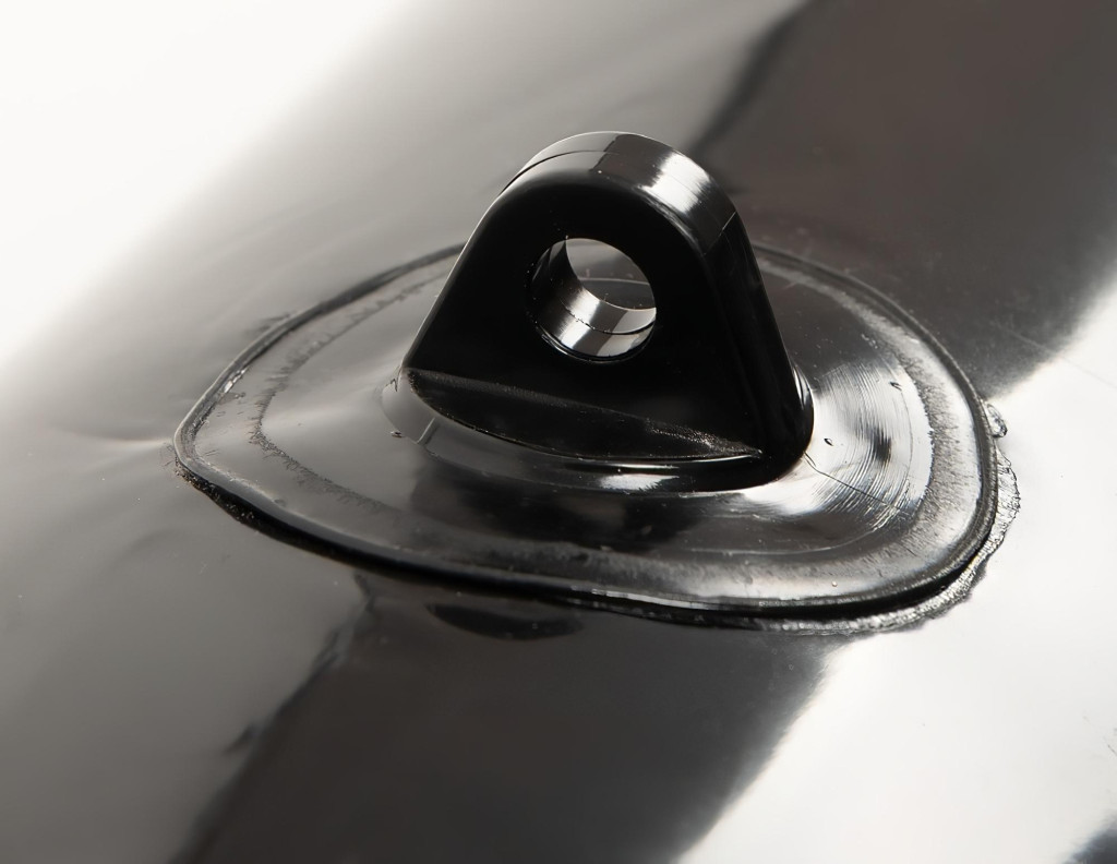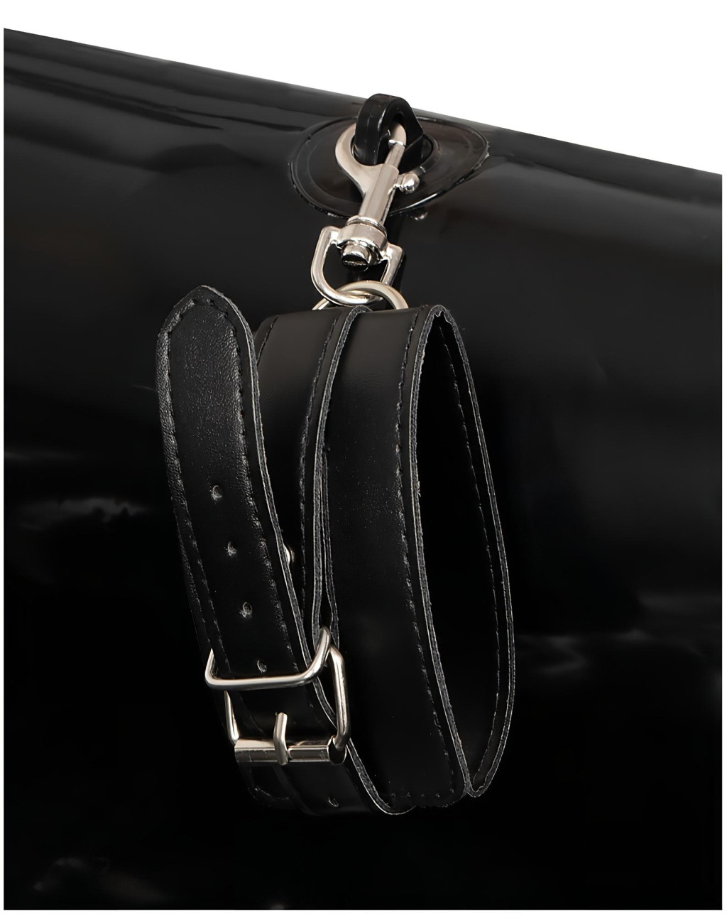 Vízlepergető felületű, csillogóan fényes anyagból készül, melynek mérete 140 x 185 cm, magassága 15cm. Vizes ronggyal könnyedén lemosható, mosógépbe rakni TILOS!Anyaga: 100% Polychlorid (Vinyl), a bilincsek pedig 85% polyurethane és 15% fém.Fekete színben.