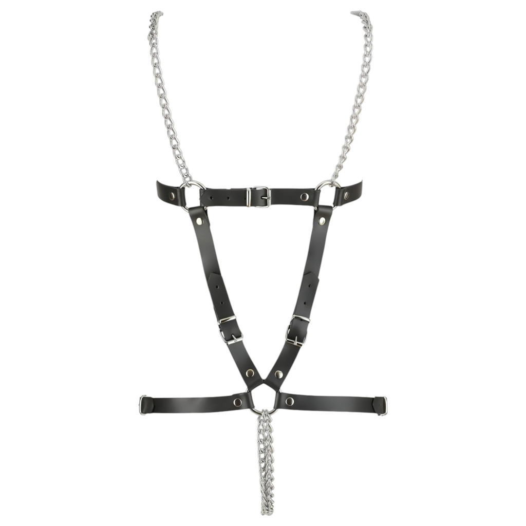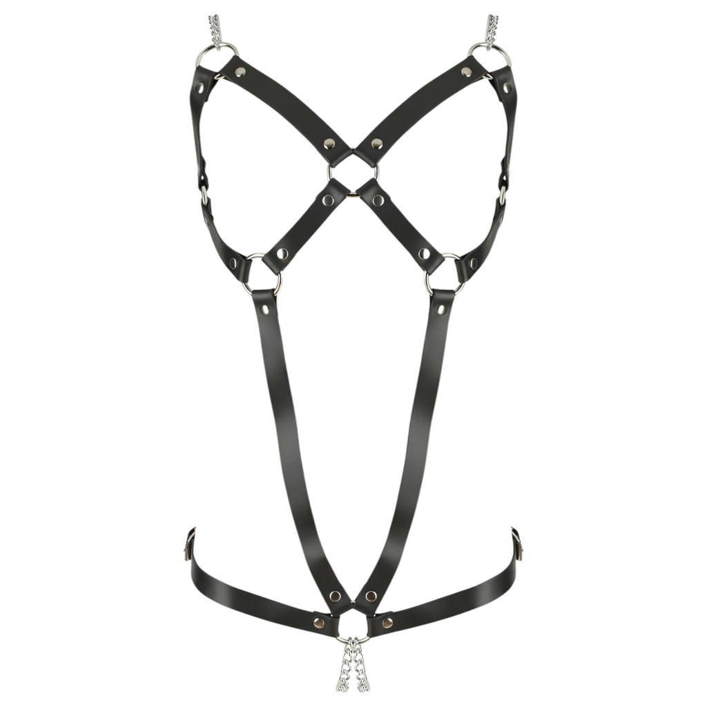 Kiváló minőségű, valódi bőr pántokból készült body, szeméremnél nyitott, láncos kialakítással, fém láncos vállpántokkal és dekoratív fém gyűrűs megoldásokkal, valamint vad szegecses díszítésekkel. A tartópántok a kívánt méretre állíthatóak.Anyaga: valódi bőr, nikkelmentes fém részekkel.Mérete: S-L (egyenméret: S, M és L méretre is passzol).Fekete színben.