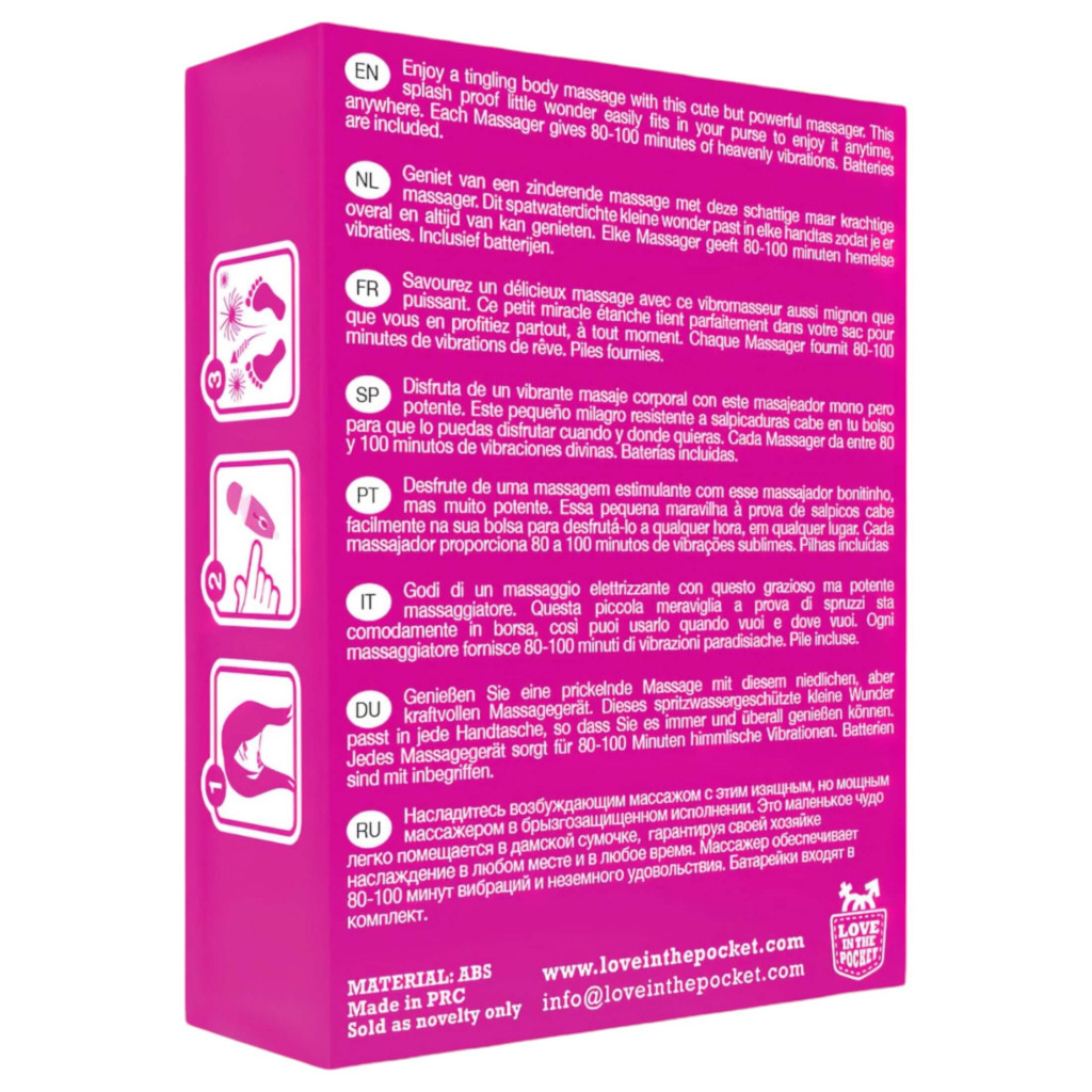 Tulajdonságok:-kiváló rezgésvezető anyag-szolid méret-lekerekített ívek-erős, egyfokozatú rezgés-egygombos vezérlés-teljes hossz: 6,5cm-fejméret: 2 x 2cm-vidám, pink-fehér színAnyaga: ABS.(EU-rendeletnek megfelelő, phthalát-mentes).A termék működéséhez szükséges elemeket a csomag tartalmazza.Az elemek nem cserélhetőek a termékben, működési idő kb. 80-100perc.