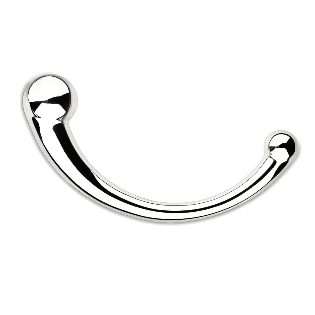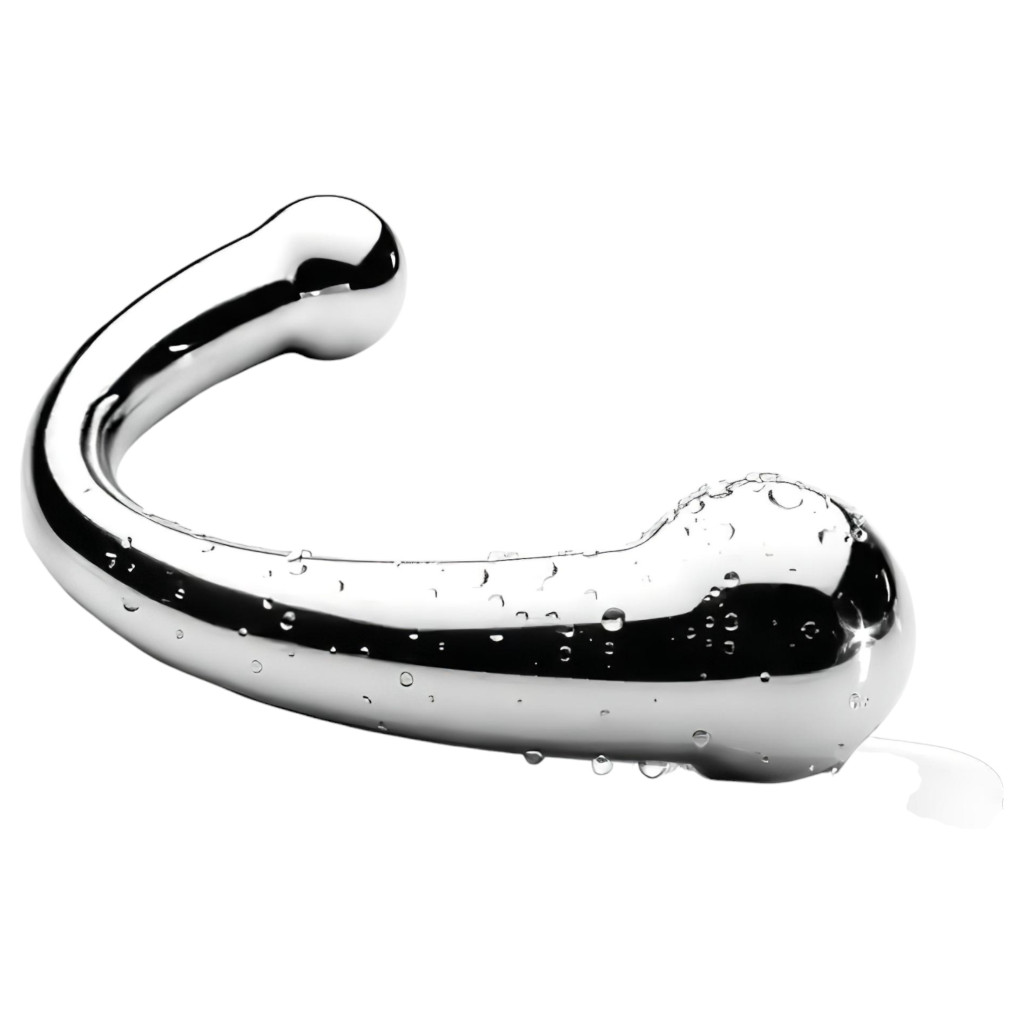 Higiénikus, teljes egészében fémből készülő G-pont, vagy prosztataizgató dildó, melynek mindkét vége használható és a hideg fém érzésével válik teljessé!Kiváló minőségű, cink ötvözetből készülő, ezüst színű, hajlított dildó, mely kialakításának köszönhetően, ideális a prosztata, vagy a G-pont kényeztetésére egyaránt.Mindkét végén, eltérő méretű, lekerekített gömbbel, így kezdőknek és haladóknak is ideális.Főbb tulajdonságok:-teljes hossz: 19,6cm-kisebb golyó átmérő: 2,5cm-nagyobb golyó átmérő: 3,8cm-tömeg: 680g (nehéz kivitel)-ezüst színAnyaga: Cink ötvözet.Használati útmutató letöltése (PDF)