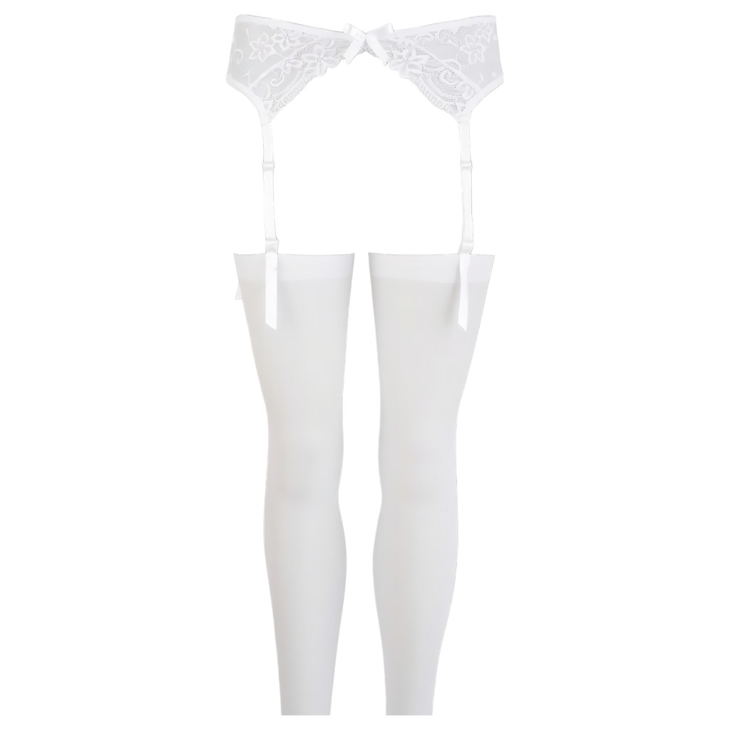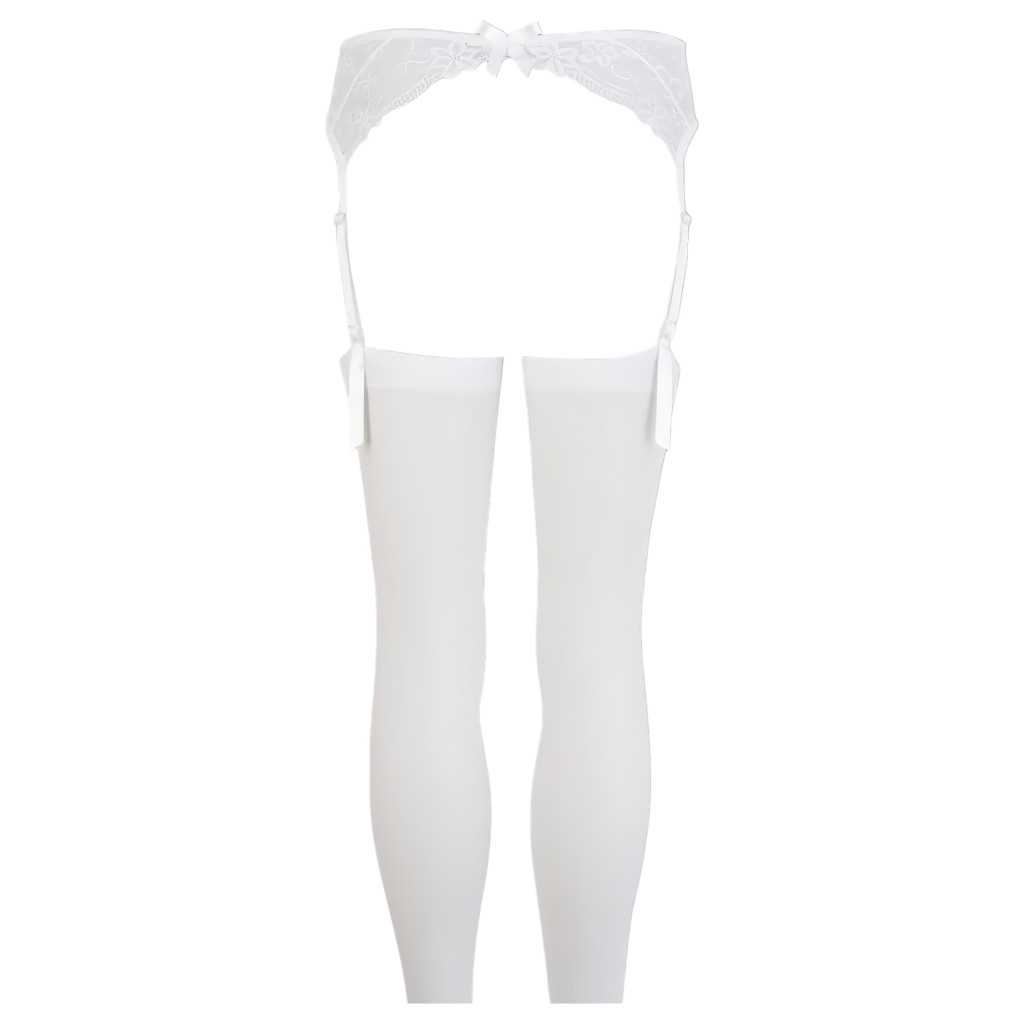 Finom, fehér csipkéből készült harisnyatartó, négy állítható harisnyatartó pánttal, középen elöl kacér kis masnival. A szetthez tartozik egy széles szegéllyel készült sima fehér harisnya. A szett anyaga: 100% Polyamid.