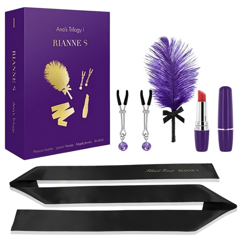 Egy igazán impozáns, érzéki, luxus szett erotikus előjátékokhoz, melynek segítségével felébresztheted a benned szunnyadó Istennőt!A szett tartalma:1db kis rúzsvibrátor:Tökéletesen diszkrét, rúzs formájú vibrációs kényeztető kiváló rezgésvezető, szilárd anyagból. Lila színben, korral színű rúzsvéggel.Egy fokozatú vibrációval, mely könnyedén elforgatással (on-off) ki- és bekapcsolható. Az elemtartó rész a kis nyíl Open felirathoz fordításával nyílik.Teljes hossza 9,5cm, átmérője 1,2-2cm.1pár mellbimbó csipesz:Csüngő, csillogó, világoskék gyöngyökkel díszített ezüst színű, kis fém csipeszek, fekete gumírozott véggel és állítható szorítási erősséggel. A csipeszek teljes hossza kb. 6,5cm.1db toll cirógató:Valódi tollak felhasználásával készült kis, lila cirógató, rövid fekete nyéllel és masnival. Teljes hossza kb. 18,5cm.1db szatén kendő:Selymesen puha, fekete színű anyagból készült hosszú sál, a szemek eltakarására, az egyéb érzékek felélesítésére, valamint a karok, vagy lábak összekötésére. Teljes hossza kb. 145cm.Mindez gyönyörű grafikákkal díszített, lila dekor tárolódobozban.A rúzsvibrátor 1db mikroelemmel (1 x AAA) működik, amit kérünk külön rendelj meg.Használati útmutató letöltése (PDF)