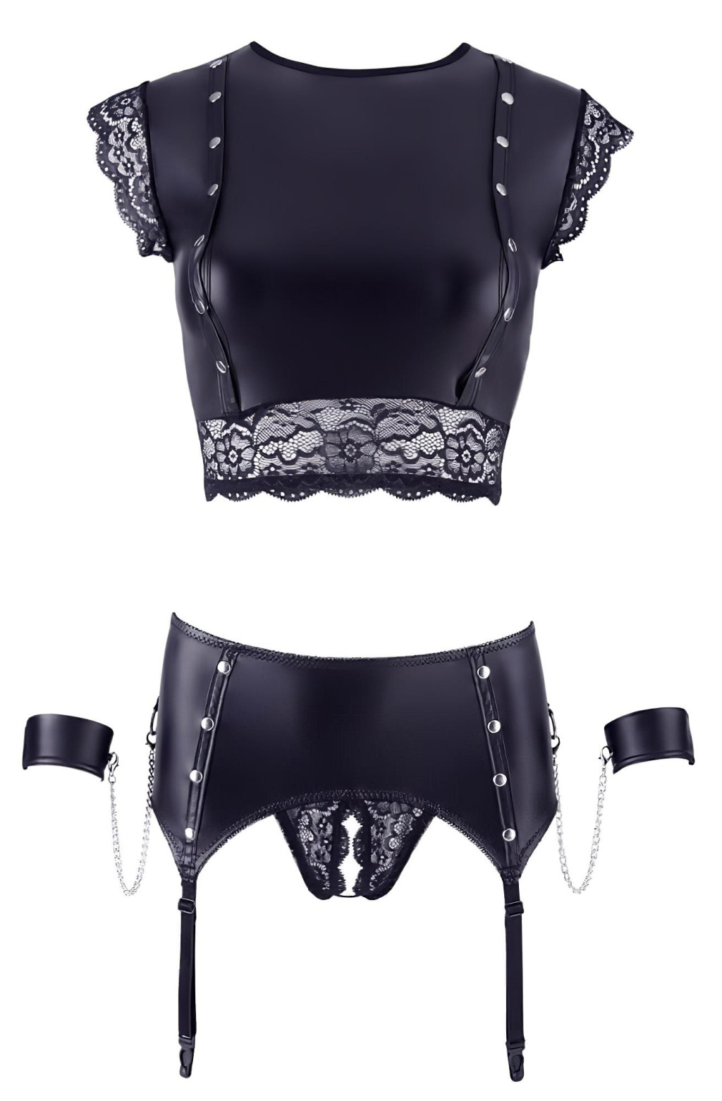 A szett tartalma:Csipkés-fényes top:-fényes, puha, rugalmas anyagból-csipkeberakásokkal az ujjaknál és az alsó szegélyen-extra rövid ujjakkal-kerek nyakkal-hátul kis gombbal záródó nyakrésszel-a kebleken, a mellbimbók vonalában fém patentokkal, melyeknek köszönhetően a keblek szabaddá tehetőekLáncos csuklóbilincs (2db):-ruganyos, fényes anyagból-tépőzárral állítható kialakítással-fém lánccal és kis karabinerrelFényes-csipke harisnyatartós tanga:-rugalmas, fényes anyagból-a szeméremnél áttetsző, virágmintás csipkéből-szeméremnél és popsinál is teljesen nyitott kialakítással-elöl és oldalt fém szegecsekkel díszítve-kétoldalt 1-1 fém rögzítőgyűrűvel-oldalanként 3-3db állítható harisnyatartó pánttal (nem levehetőek)-rugalmas derékrésszelAnyaga: 90% Polyester, 10% Elasthan.A csipke anyaga: 90% Polyamid, 10% Elasthan.Fekete színben.A harisnyát a csomag nem tartalmazza.