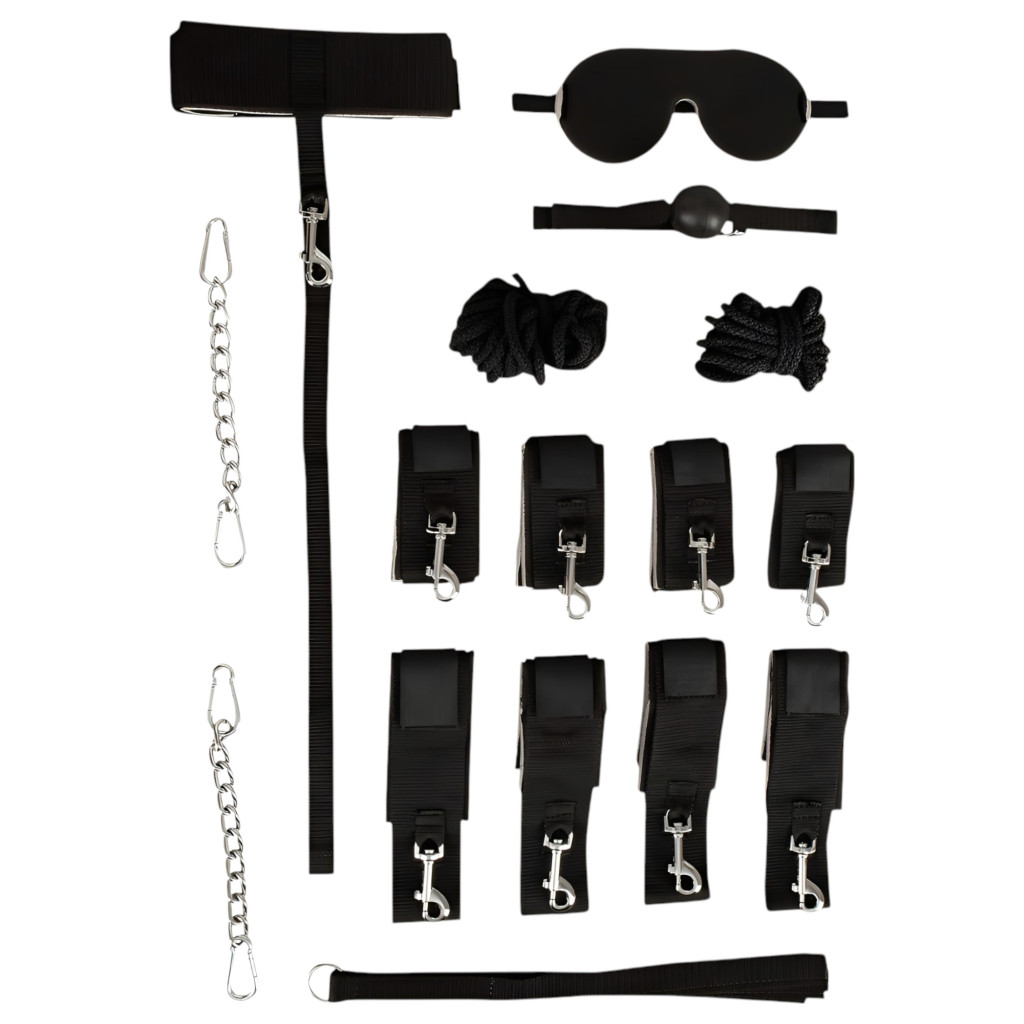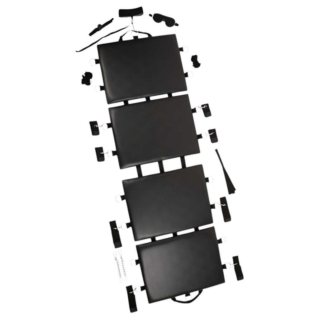 A szett tartalma:Összecsukható, párnázott fekvőfelület (pántokkal, hevederekkel, D-rögzítőgyűrűkkel)8db párnázott, tépőzáras kötöző pánt karabinerekkel (karok, lábak korlátozására)1db párnázott, tépőzáras nyakpánt karabinerrel és pórázzal1db szájpecek, állítható fejpánttal1db párnázott szemmaszk, gumis fejpánttal1db minikorbács (fegyelmezéshez)2db bondage kötél2db fém lánc, mindkét végükön karabinerrel Főbb adatok:Szállítási méret: 60 x 60cmMax. méret kihajtott álapotban: 60 x 193cm4db csuklópánt méretei - hossz: 39cm, szélesség: 5cm (tépőzárral állítható)4db lábpánt méretei - hossz: 56cm, szélesség: 5cm (tépőzárral állítható)Mind a 8db bilincs 6,5cm-es fém karabinerrel van ellátvaNyakörv - hossz: 57,5cm, szélesség: 5cm (tépőzárral állítható)Szájpecek - átmérő: 4cm, fejpánt hossz: 59cm (mérete 2db fém gyűrűvel állítható)8 szálas Korbács - hossz: 37cm, 12cm hosszú nyéllel és D-rögzítővelSzemmaszk mérete: 19cm hosszú, gumis pánttalBondage kötelek - hossza: 4,5m és 3mLáncok - hossza: 25cm (mindkét végükön karabinerrel)Tömeg: 7,1kgAnyag: Polyester, Polypropylene, Pamut, Polyamide, PVC, Fém, TPE.Használati útmutató letöltése (PDF)